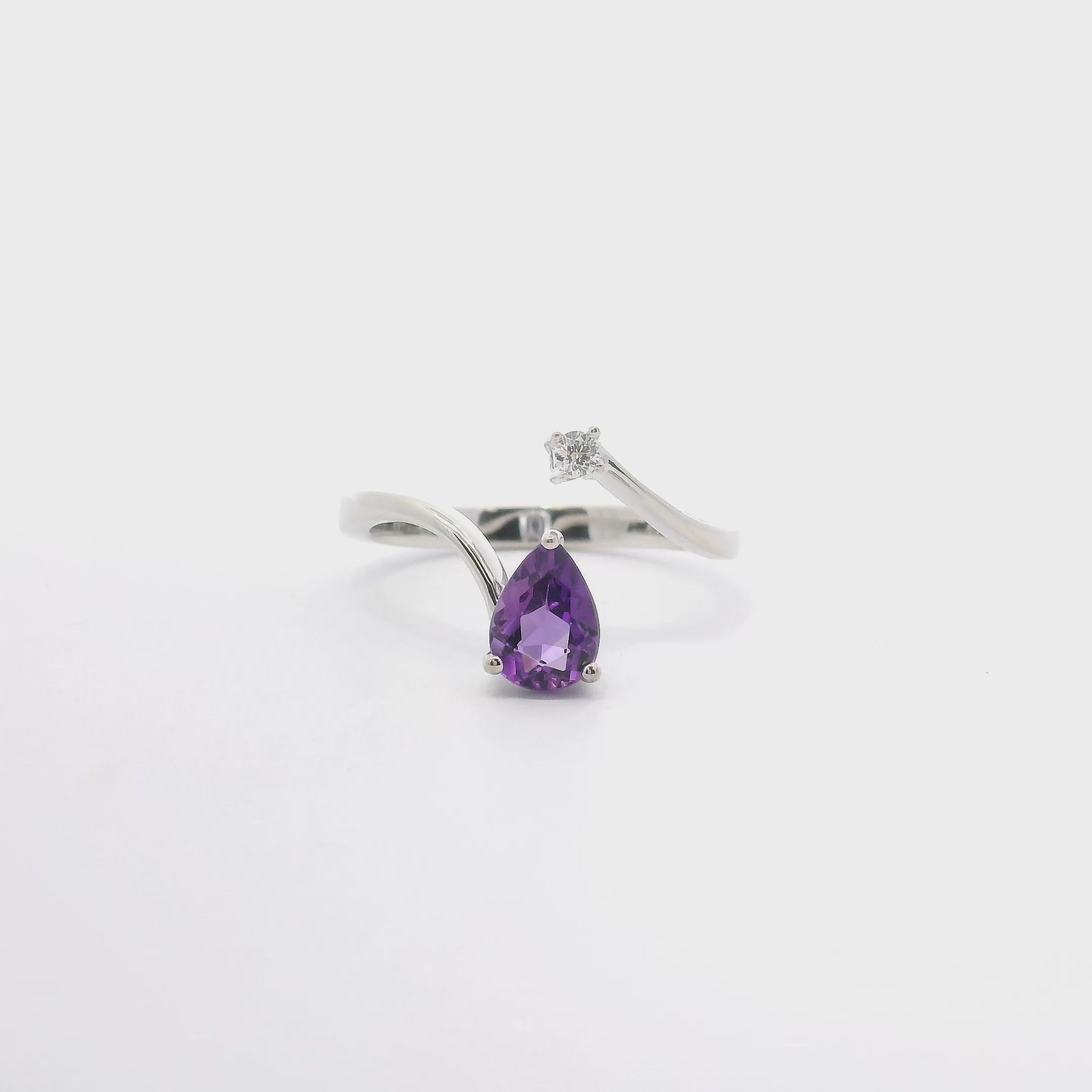 14KT WHITE GOLD BYPASS RING FEATURING A .45CT AMETHYST AND A .05CT SI2 G-H NATURAL DIAMOND