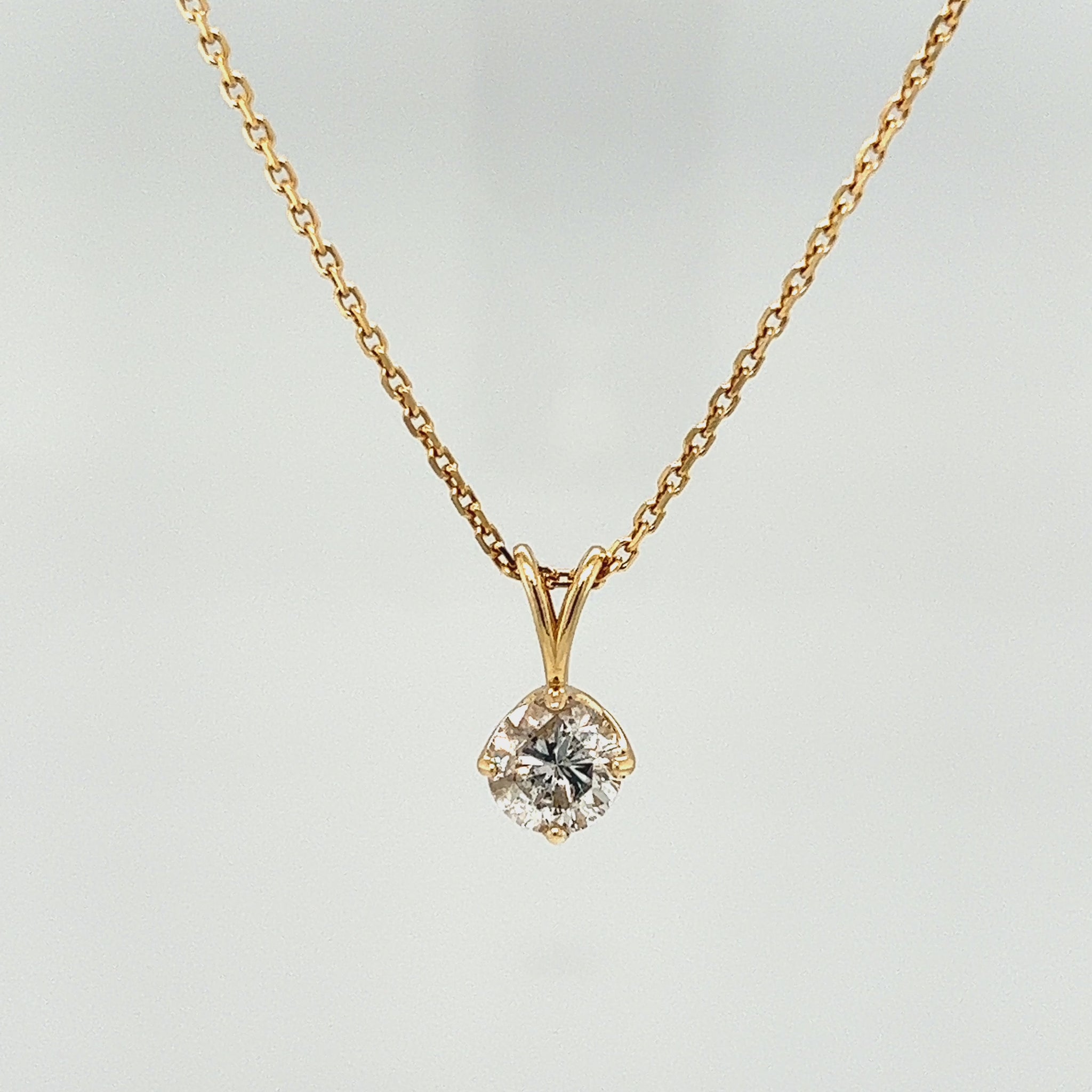 A classic staple to any jewelry collection, this 14k Yellow Gold Solitaire pendant features a Round cut Natural Diamond that is 1.50 carats, H in color and I2-I3 in clarity. Chain is not included.