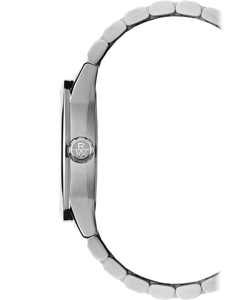 The balance-and-spring assembly is the focus of attention of this freelancer Calibre RW1212 black steel bracelet watch, framed by a 42.5 mm case. The diamond-polished balance wheel and skeletonized bridges ensure transparent visibility extending to the very heart of the watch. Powered by a mechanical self-winding movement, the freelancer “Calibre RW1212” beats at a frequency of 28,800 vibrations per hour and has a 38-hour power reserve.