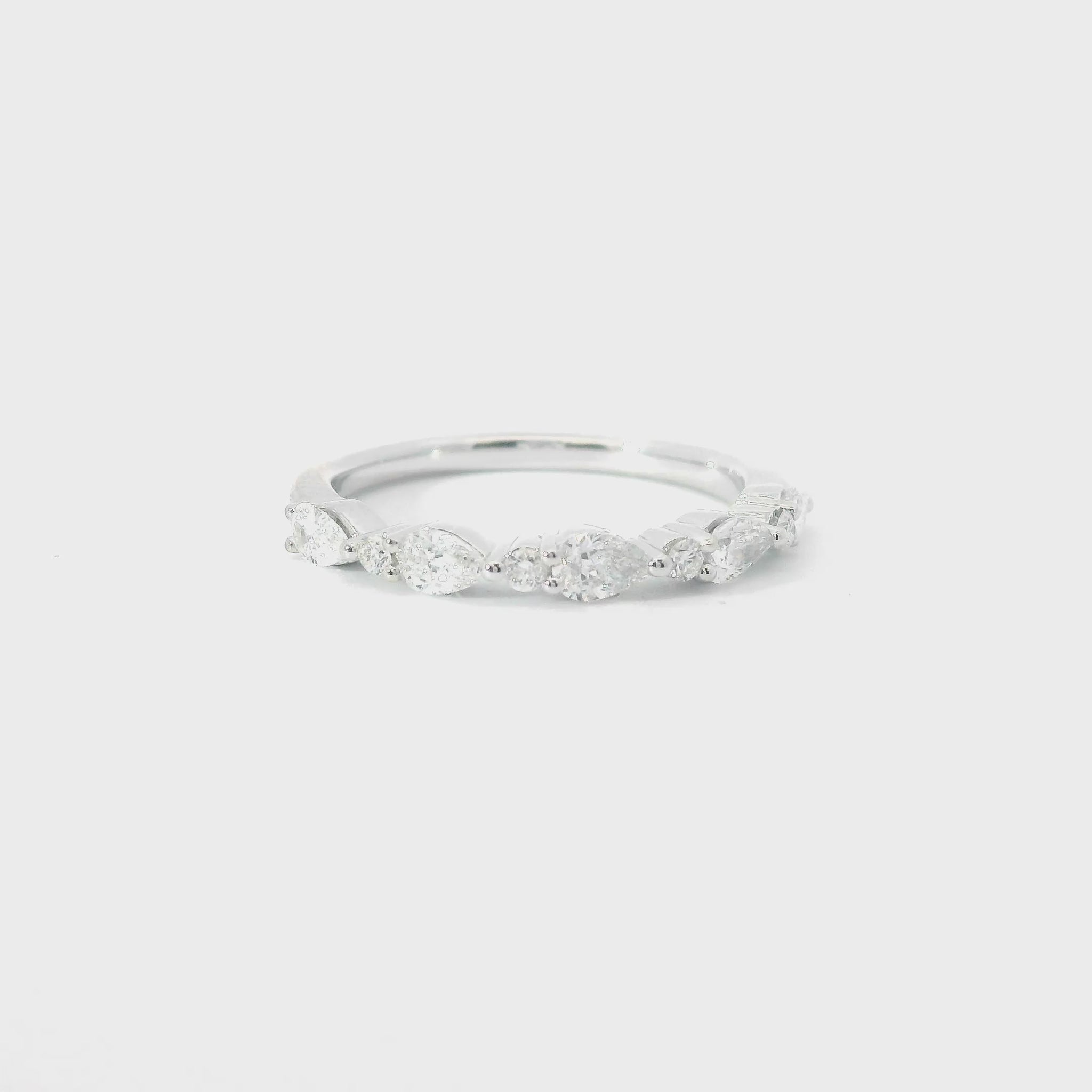 This 14KT white gold band features a combination of pear shape and round diamonds, totaling .55cttw and graded SI2-I1 clarity and G-H color. The unique design and high-quality diamonds make this band a stunning and timeless addition to any jewelry collection.